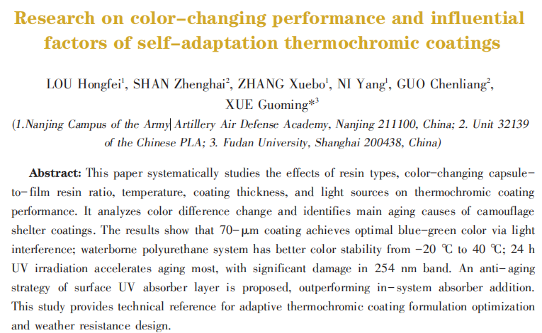 (The full journal article can be accessed via https://www.cnki.net by searching the article title “Analysis of the Color-Changing Performance of Adaptive Thermochromic Coatings and Its Influencing Factors”.)