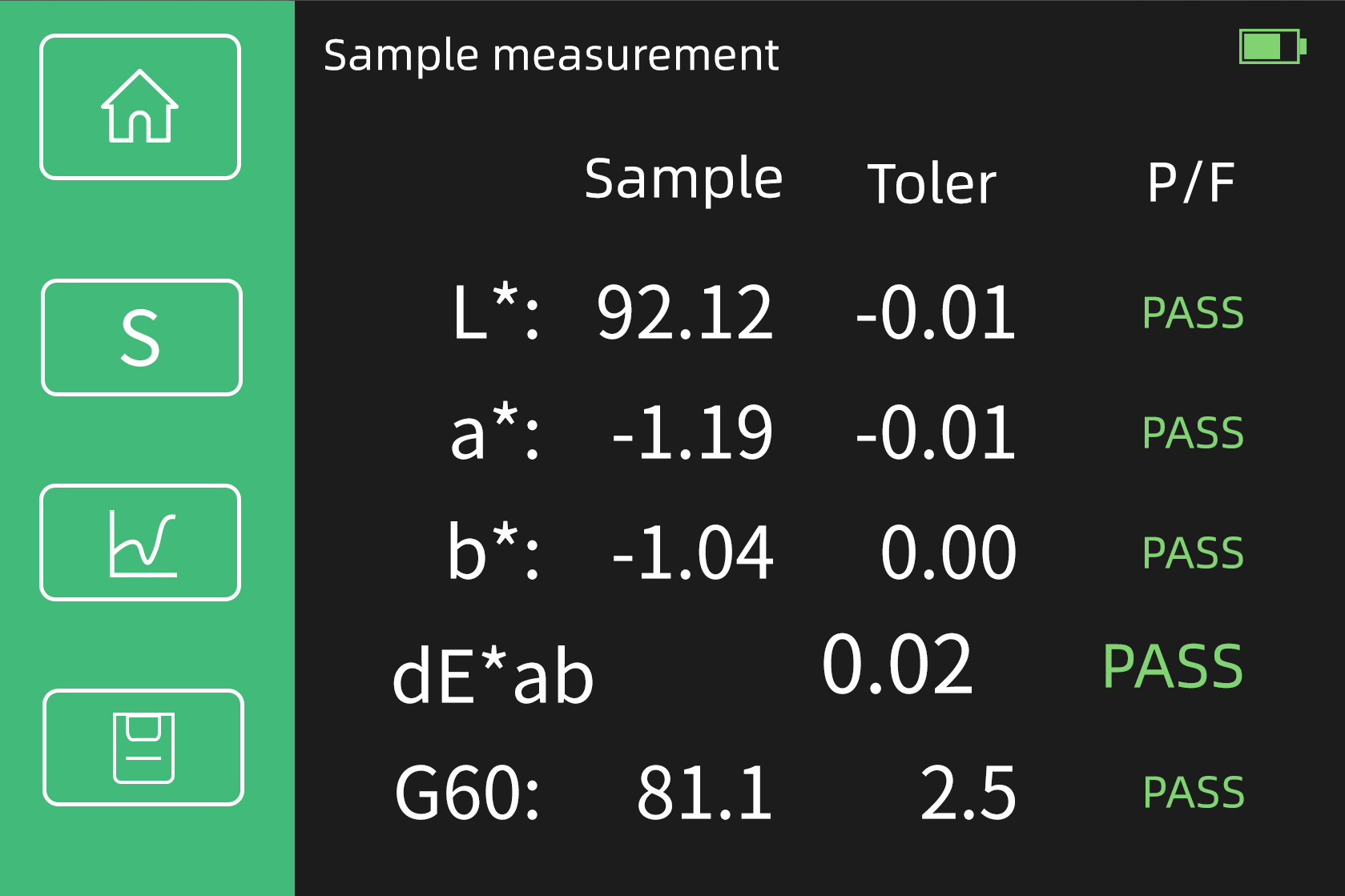 Spectral reflectance, CIE-Lab, CIE-LCh, Hunter Lн,ан,bн, CIE-Luv, XYZ, Yxy, RGB, Color Difference (ΔEab, ΔEcmc, ΔE94, ΔE00), Whiteness (ASTM E313-00, ASTM E313-73, CIE, ISO2470/R457, AATCC, Hunter, Taube Berger Stensby), Yellowness (ASTM D1925, ASTM E313-00, ASTM E313-73), Blackness (My, dM), Color Fastness to Rubbing, Color Fastness to Light, Tint (ASTM E313-00), Color Density CMYK (A, T, E, M), Metamerism Index Milm, Munsell, Hiding Power, Tinting Strength (Dye Strength, Color Strength) |